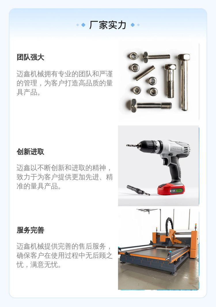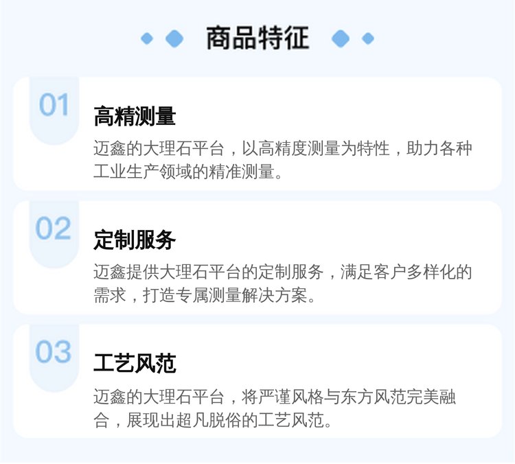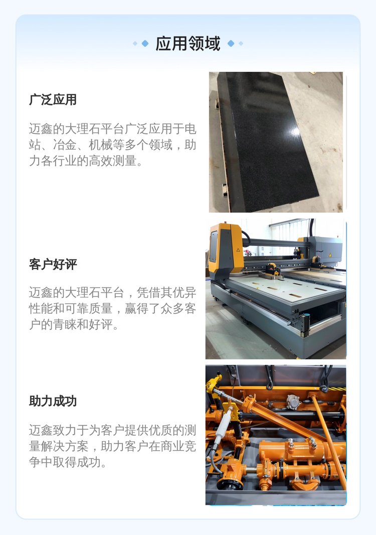 泊头市迈鑫机械铸造有限公司是测量解决方案供应商,专注于与客户建立长期合作伙伴关系。我们拥有热诚的员工和强大的能力,快速响应客户需求,提供客户化的产品和的服务,助力客户商业成功。现代工量具为多家大型企业设计、开发、加工产品。公司以的队伍、严谨的管理,着力打造现代量具及其测量仪器系列。“尽显细致工艺”的迈鑫,彰显不凡、锐意革新、进取不息的精神,形成了现代幻变灵动的设计理念。兼容并蓄、博采众长的虚怀纳百川之风范,将严谨风格与东方风范合璧,形成了现代超凡脱俗的工艺与风格。细致的传播者——“迈鑫”,恒久不辍的打造着世界量具的新文化。我公司的主要产品有铸铁工作台系列:铸铁平板、铸铁平台、划线平台、铸造平台、检验平板、检测平台、铆焊平板、测量平台、装配平台、钳工平台、基础平台、试验平板、铝型材检验平台、落地镗床工作台、大理石平板、花岗石平台、螺纹塞规、光滑环规、塞环规等产品,产品广泛应用于电站、冶金、机械、化工、船舶、科研、环保、航空、汽车、农机、电器、仪表、器械、五金等生产领域,公司自成立以来产品的质量以及售后服务赢得了客户的一致好评。