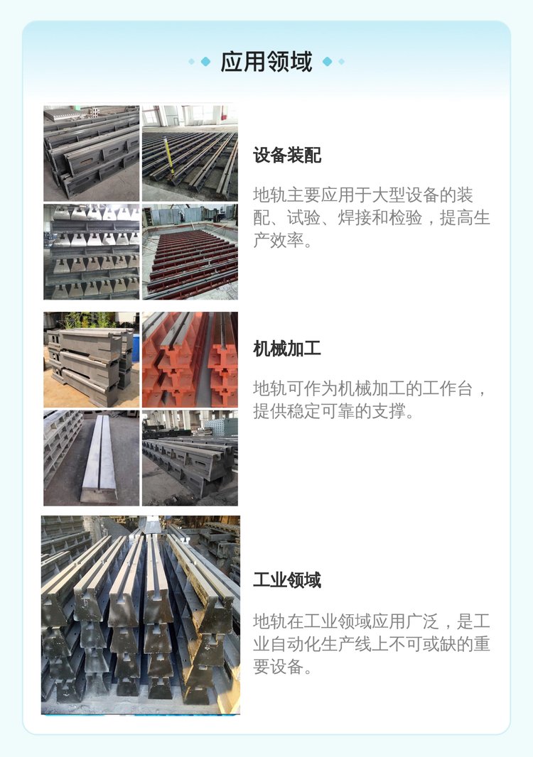 地轨的用途:根据设备的固定点来设计、拼接成铸梁平台,主要用于大型设备的装配、试验、焊接和检验