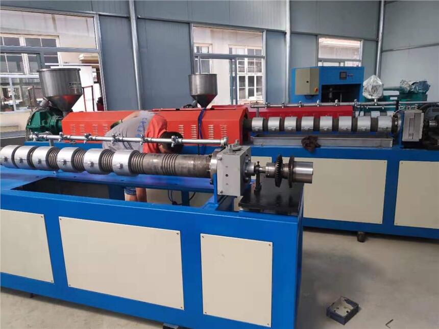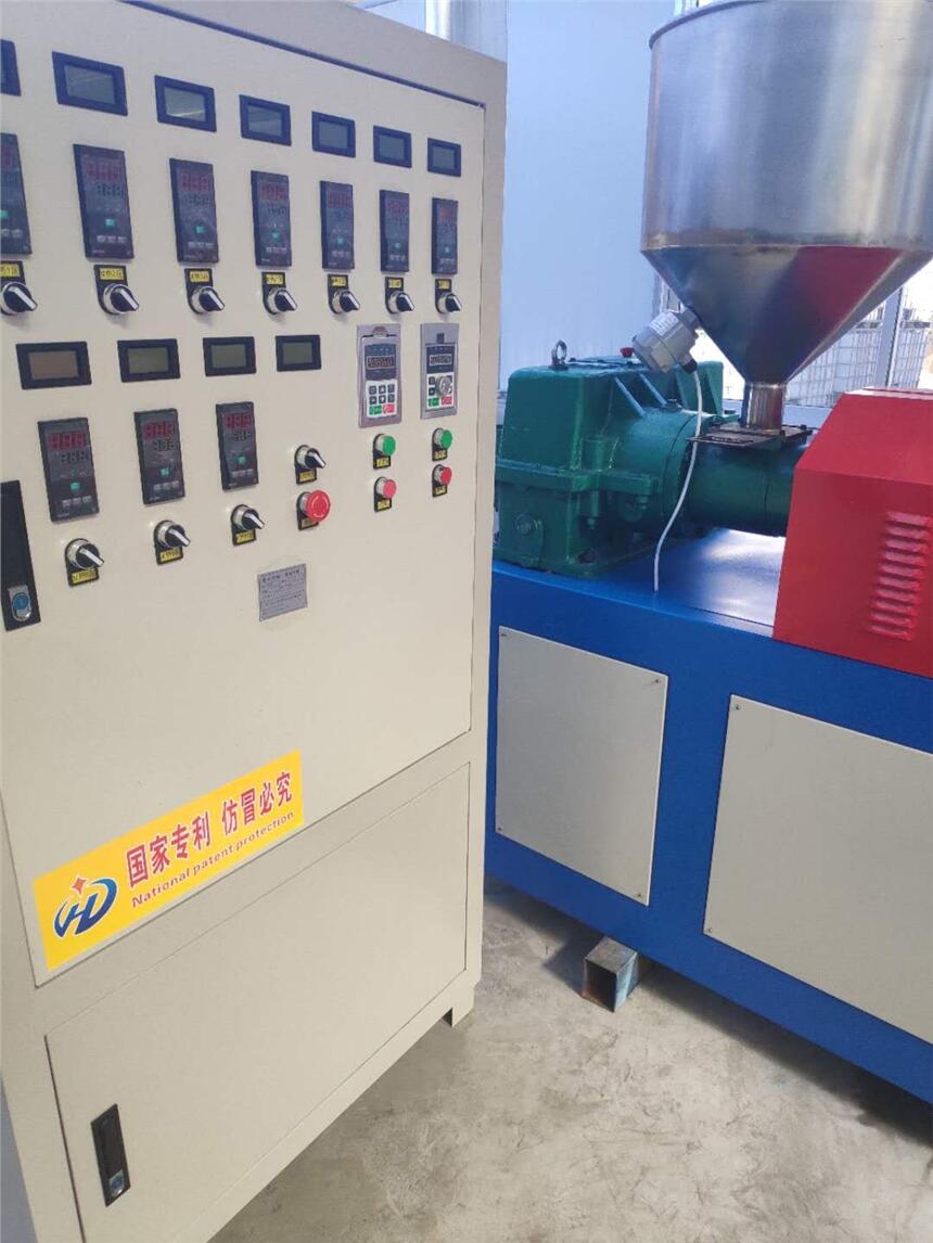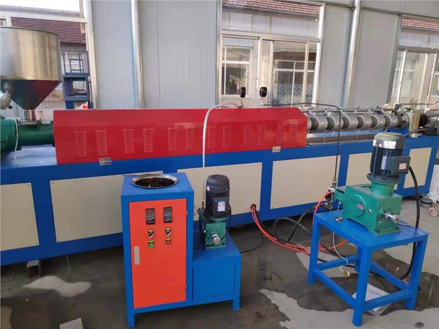 塑料发泡网挤出机组,将树脂等多种化工原料通过料斗加入料筒内,经过加热后将发泡气体注入料筒内,经料筒搅拌从模头挤出冷却成形,输入牵引机,经切刀自动切断制出不同规格的发泡网套,也可以通过更换机头、模具生产出不同规格的发泡网