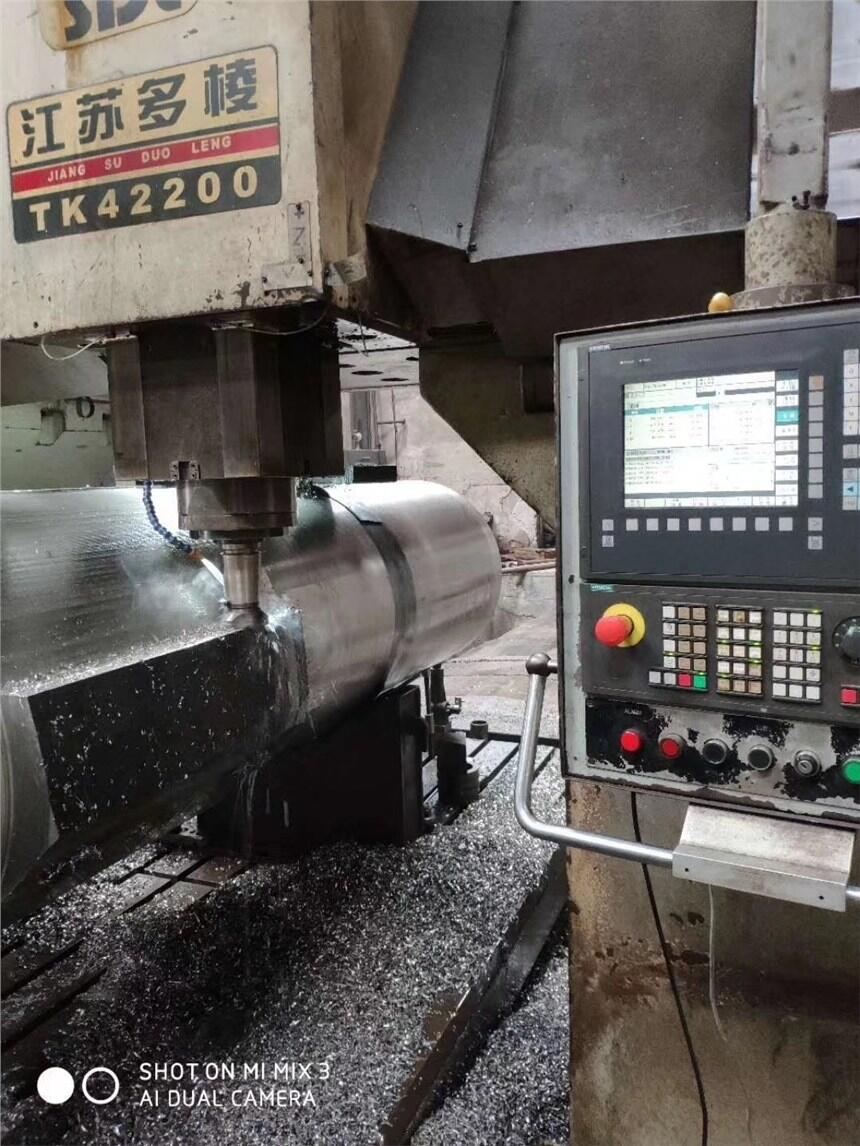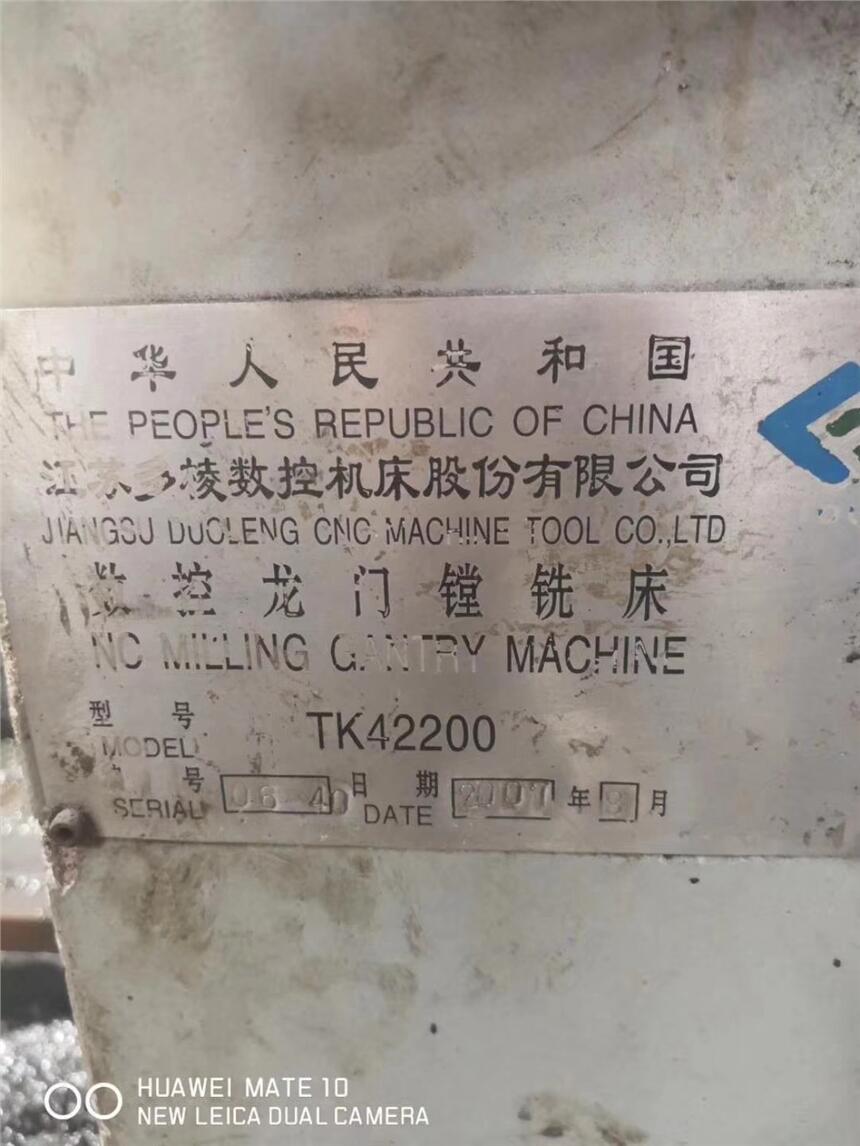 出售:江苏多棱8米数控龙门镗铣床型号TK42200,工作台2x8米龙门过宽2.5米,工作台T型槽宽28*10三轴行程XYZ8500*2700*1000mm或1250mm主轴端面至工作台距离:200-1200mm主电机功率37KW主轴转速范围10-2000r/min主轴最大输出扭矩1000NM主轴锥孔:50主轴直径100mm主轴轴承循环冷却方式:油冷三轴快速移动10米每分钟切削进给速度1-5000mm/min工作台承重32吨西门子840D系统,刀柄规格BT50方滑枕尺寸:400*400mm机床尺寸1500*6500*6000mm机床重量:85吨一个万能头,一个直角头,一个加长头