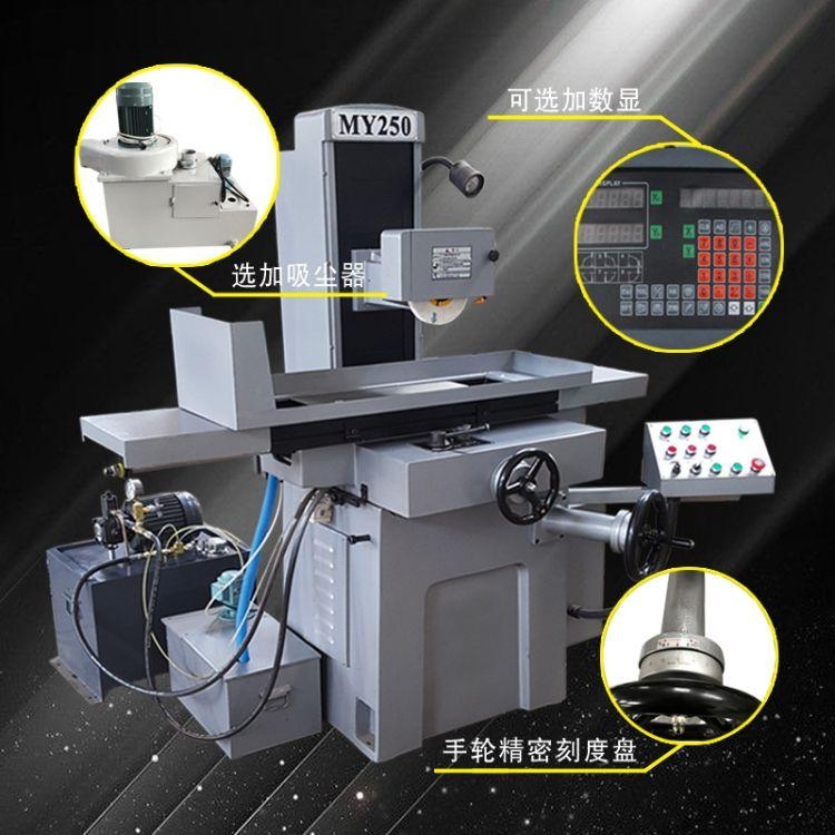 MY-250液压平面磨床X轴采用液压传动系统,液压系统由一套电机定量泵组成,泵流量20 L/min,电机功率1.5KW,泵的工作压力可达3mpa,系统压力由溢流阀调节,系统主机械阀采用台湾丰田原厂磨床专用阀,该阀由换向控制和节流调速控制两部分组成,节流阀调速部分还有卸荷功能,可实现工作台的启停,此阀同时具备缓冲调节功能。Y轴采用直流减速电机,细牙丝杆传动,磨床专用驱动器控制。该系统由一套电机,同步带,同步带轮组成,该自动进给系统可实现断续进给和连续进给,进给速度可实现无级调速,精确控制进刀尺寸。该机床操作方便、加工精度高、运动稳定、热稳定性好、噪声低,维护保养方便。