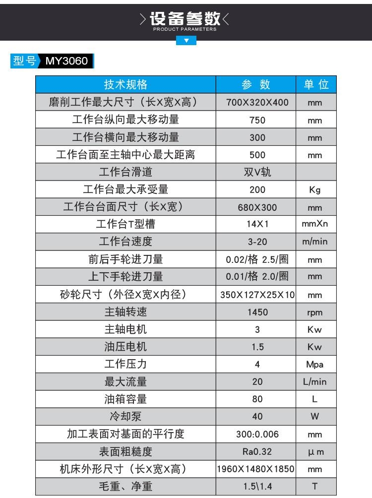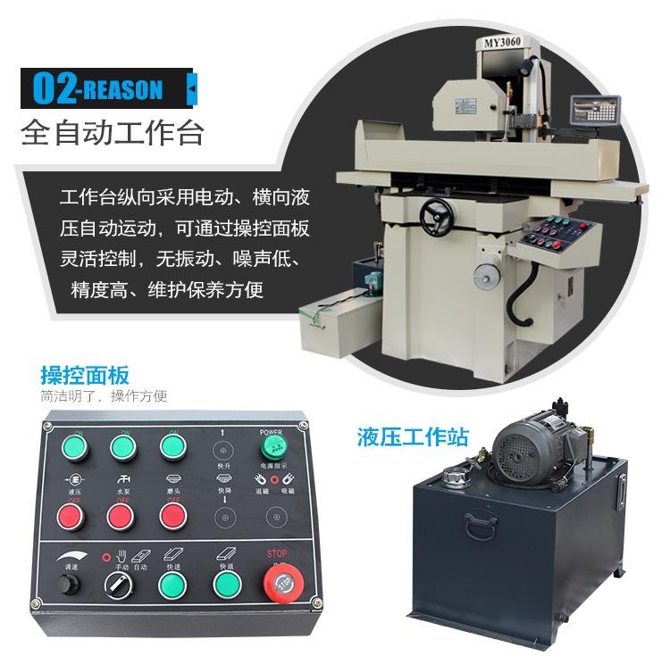 ? ?MY-3060液压平面磨床X轴采用液压传动系统,液压系统由一套电机定量泵组成,泵流量20 L/min,电机功率1.5KW,泵的工作压力可达3mpa,系统压力由溢流阀调节,系统主机械阀采用台湾丰田原厂磨床专用阀,该阀由换向控制和节流调速控制两部分组成,节流阀调速部分还有卸荷功能,可实现工作台的启停,此阀同时具备缓冲调节功能。Y轴采用直流减速电机,细牙丝杆传动,磨床专用驱动器控制。该系统由一套电机,同步带,同步带轮组成,该自动进给系统可实现断续进给和连续进给,进给速度可实现无级调速,***控制进刀尺寸。该机床操作方便、加工精度高、运动稳定、热稳定性好、噪声低,维护保养方便。