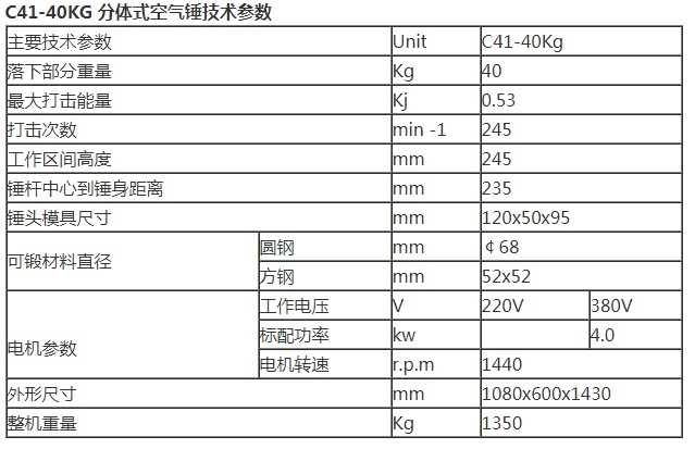C41-40kg空气锤适用于锻工车间对各种形状零部件的自由锻造。如延伸、礅粗、热剪、锻接、扭转和弯曲等。使用开式垫模可以进行各种模锻。广泛应用于五金工具、医疗器械、金银加工、制造业、农机具及铜管厂等。