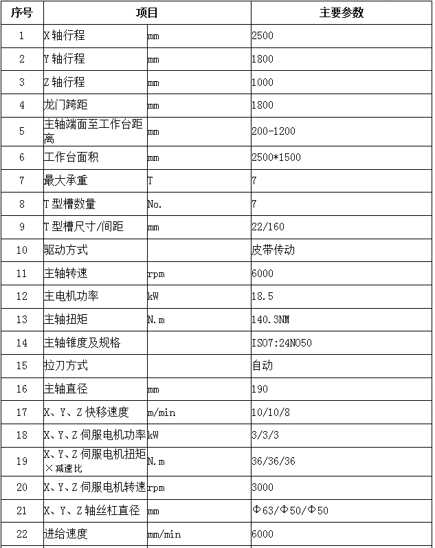描述:18系列龙门工作台前后移动(X向)为55滚柱直线导轨,横梁方向(Y向)导轨为55滚柱直线导轨、主轴上下方向(Z向)导轨为重切贴塑复合型硬轨;按国际、国内相关标准装配、检验、油漆完工。