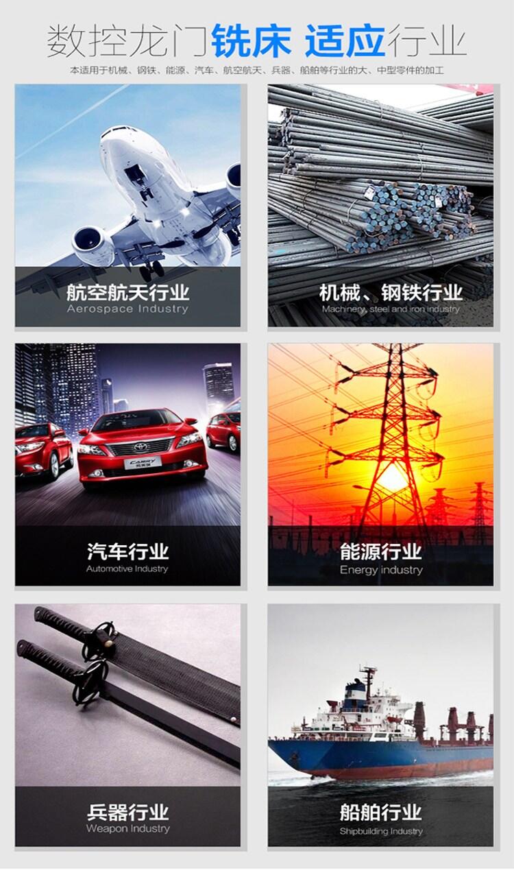 数控龙门铣床的结构特点:固定式床身、工作台移动;主轴箱随溜板上下移动;亦可沿横梁左右移动实现三轴联动;配置18.5kW主铣头。机床具有铣削、镗削、钻削、锪孔、攻丝等功能,适用于机械、钢铁、能源、汽车、航空航天、兵器、船舶等行业的大、中型零件的加工。配备附件铣头后可实现工件的一次装夹,安装直角铣头可五面加工,一机多用,提高了工件的加工效