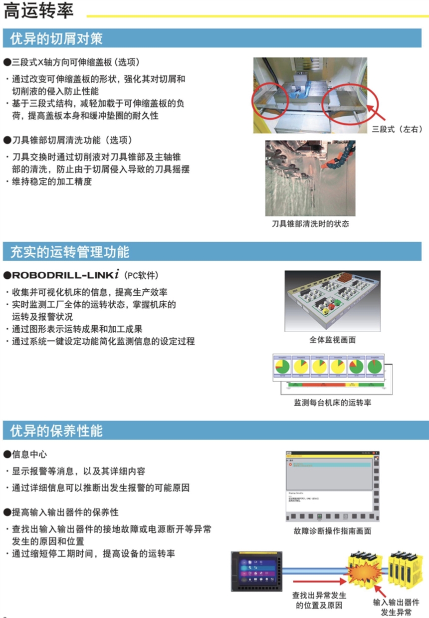 11、在高速动作时不易振动,实现高速平滑的运动性能ROBODRILL配有五轴高速加工中心新的FANUC-31iB数控系统,主轴采用高功率规格,五轴高速加工中心高转速24000 r/min,尤其适合高精度模具的加工 ROBODRILL侧门为气动门,能够与机器人实现联动,缩短系统节拍 FANUC铜电极加工率解决方案。发那科小型加工中心发那科钻攻机