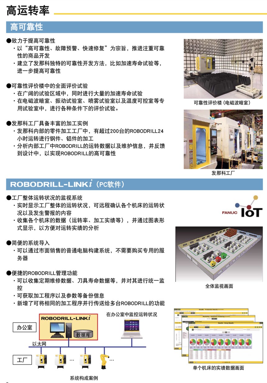 11、在高速动作时不易振动,实现高速平滑的运动性能ROBODRILL配有五轴高速加工中心新的FANUC-31iB数控系统,主轴采用高功率规格,五轴高速加工中心高转速24000 r/min,尤其适合高精度模具的加工 ROBODRILL侧门为气动门,能够与机器人实现联动,缩短系统节拍 FANUC铜电极加工率解决方案。发那科小型加工中心发那科钻攻机