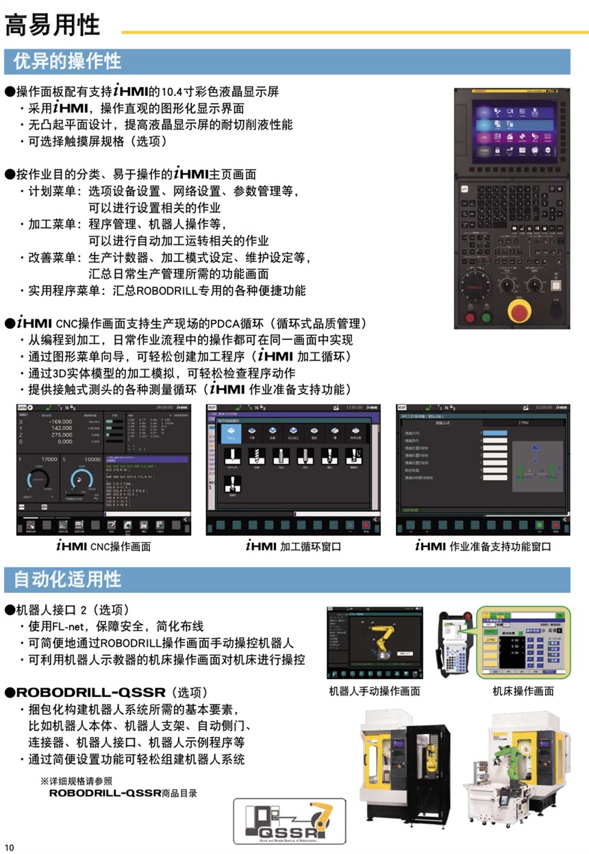 10、加工中心能机器人LR Mate 200iD五轴高速加工中心大负载为7 kg,重复定位精度0.02mm,能轻松应对较大、较重工件的快速上下料,在保证精度的前提下提高生产效率 LR Mate 200iD自重仅25 kg,适合狭窄空间场合的作业;并采用高刚性手臂和五轴高速加工发那科小型加工中心发那科钻攻机a-D21MiB Plus/a-D14MiB Plus