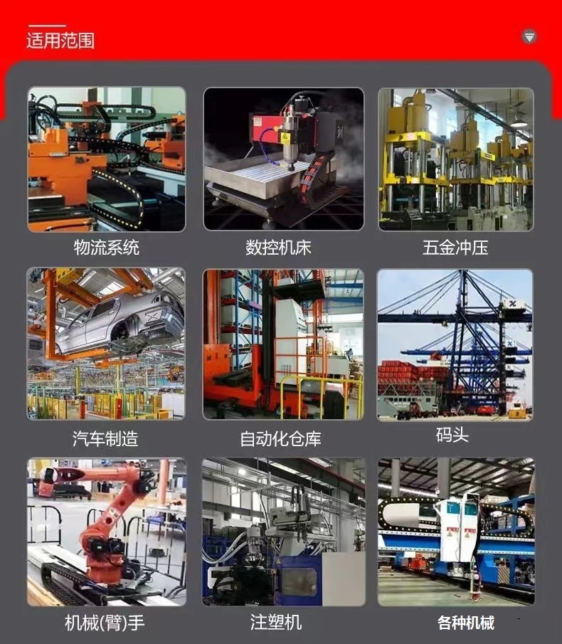 3、拖链已被广泛应用于数控机床、电子设备、石材机械、玻璃机械、门窗机械、注塑机、机械手、起重运输设备、自动化仓库等。