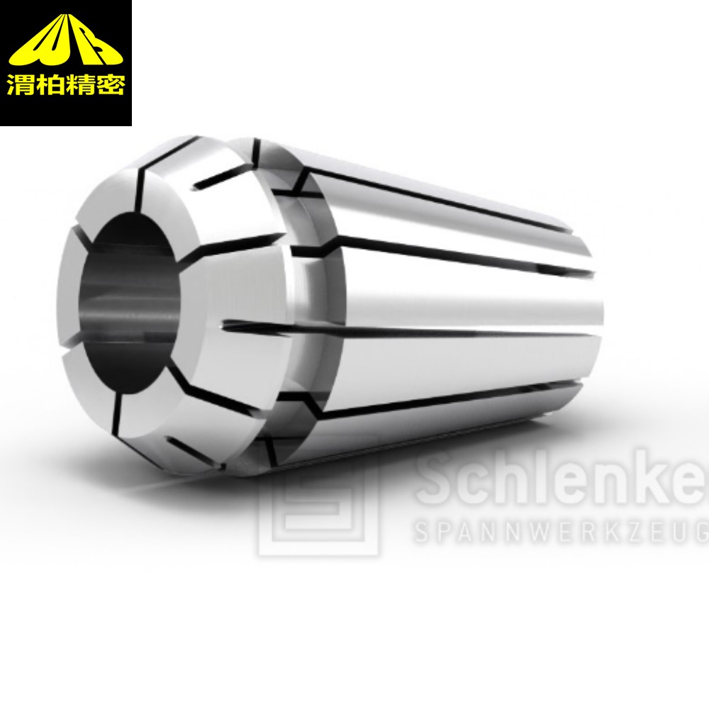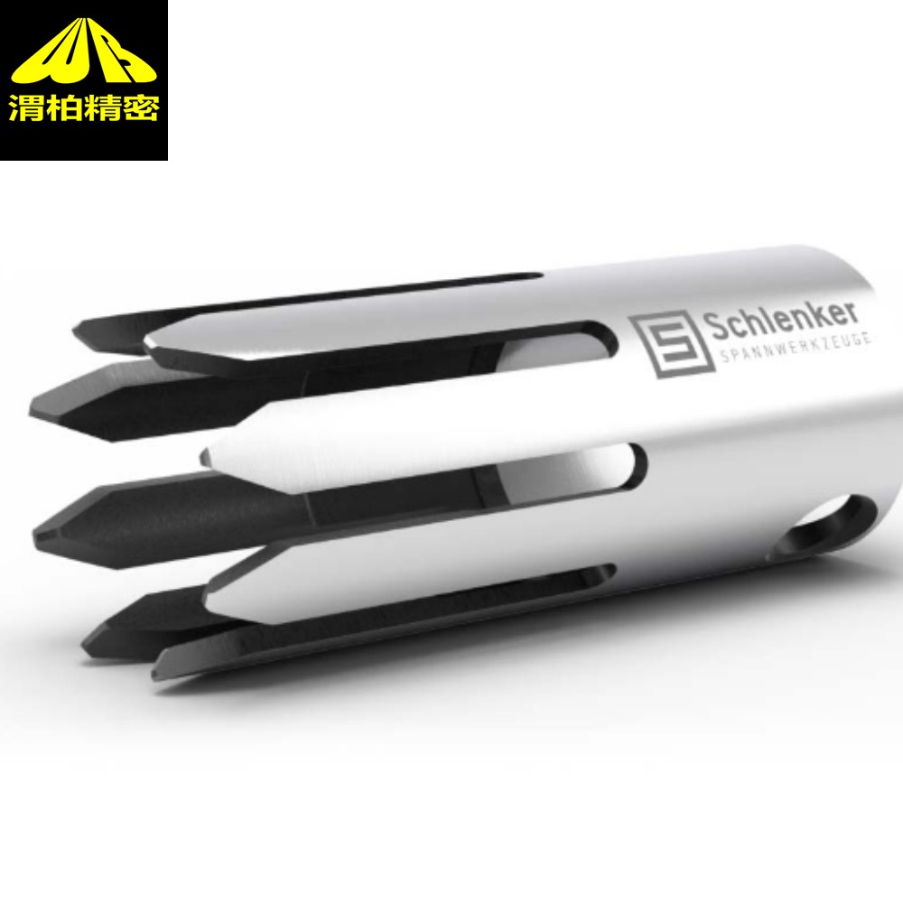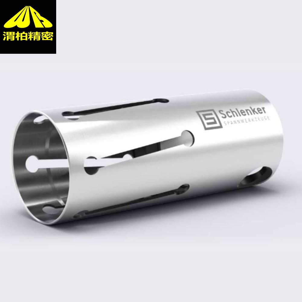 施伦克ER夹头Schlenker夹头直径小于3英寸的工件采用。弹簧夹头对工件的长度有所限制,特别地,弹簧夹头限制机床的轴向(Z轴)行程范围,因为它的长度比卡爪卡盘长。schlenker夹头当工件的加工长度差不多需要用到机床的整个可用行程时,大概就要采用卡爪卡盘了。压力夹头通过压力套筒夹紧,压力套筒将压力夹头沿轴向压靠在管接螺母上。