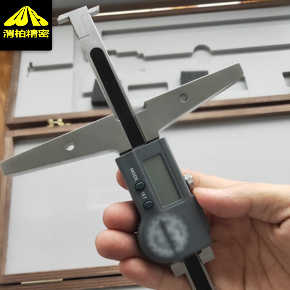 深度游标卡尺用于测量凹槽或孔的深度、梯形工件的梯层高度、长度等尺寸,也被简称为“深度尺”。如测量内孔深度时应把基座的端面紧靠在被测孔的端面上,使尺身与被测孔的中心线平行,伸入尺身,则尺身端面至基座端面之间的距离,就是被测零件的深度尺寸。