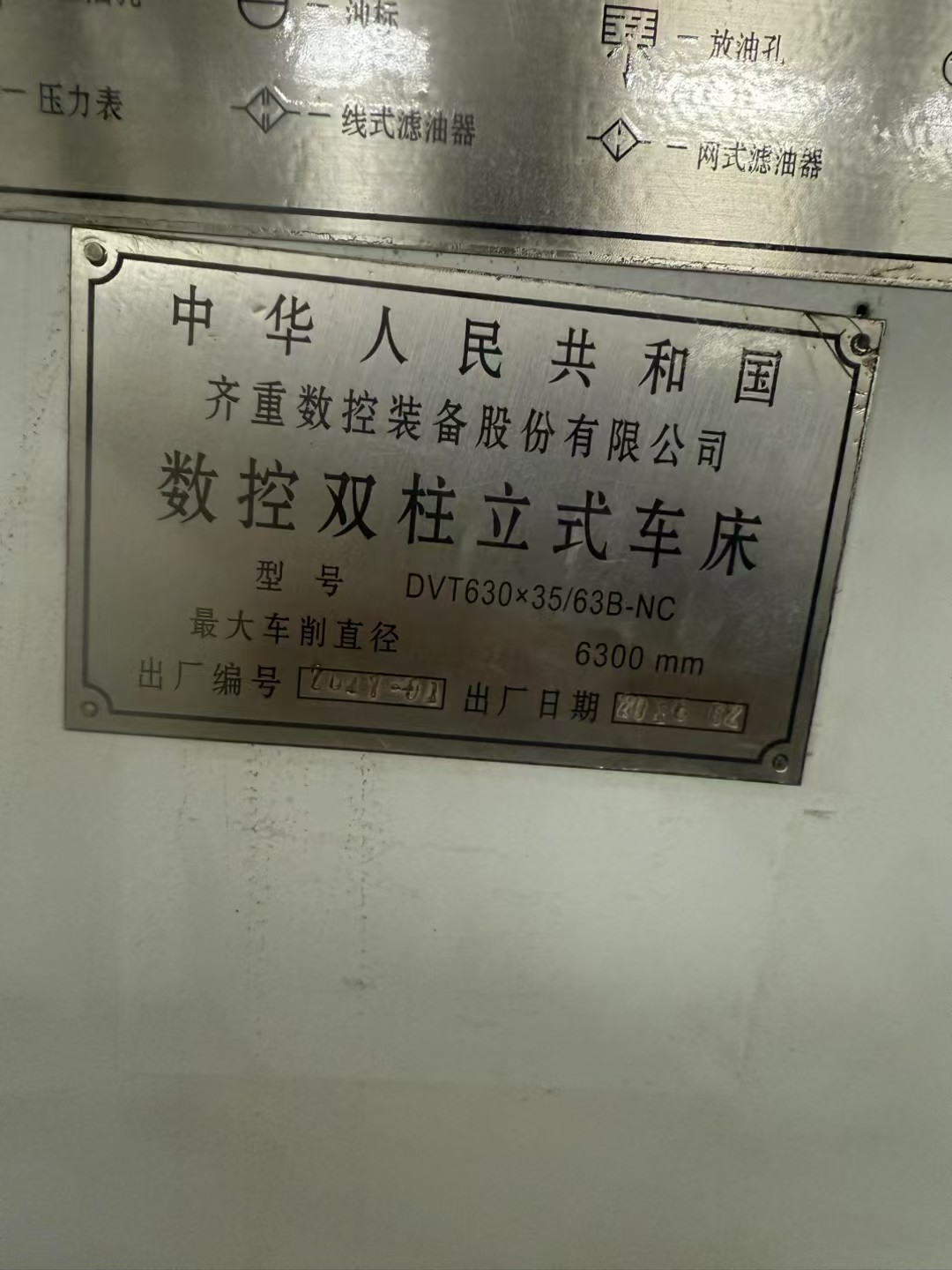 售:齐重6.3米数控双柱立式车床型号DVT630?35/63,加工高度3.5米,承重63吨,西门子系统,在位闲置,99乘新