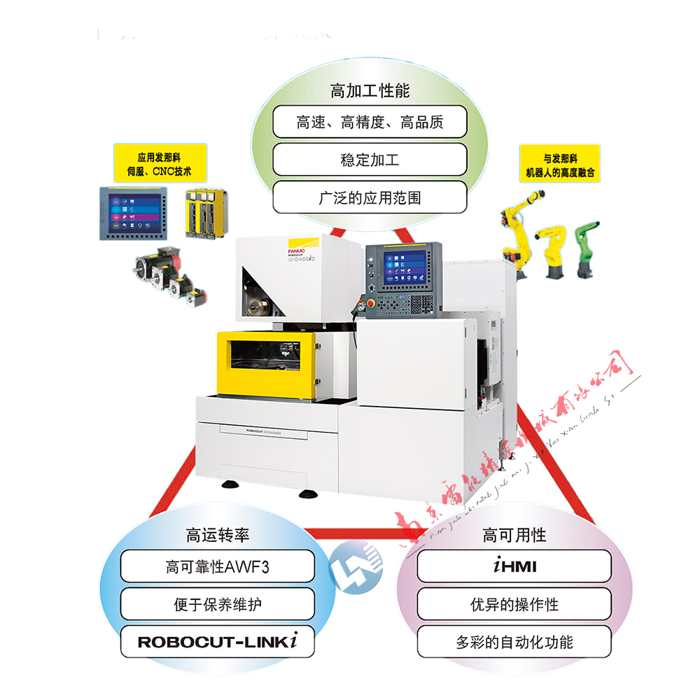 发那科慢走丝(FANUC慢走丝)型号:α-C400iC、α-C600iC、α-C800iB、发那科慢走丝所有机型均为日本原装进口,所有机型提供36个月保修。配合FANUC系统、温度补偿、固定料芯、三维坐标旋转、高**自动穿丝、实现高品位切割加工。