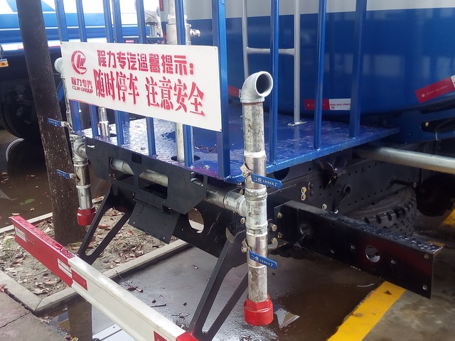 洒水车目前采用东风,解放系列取力箱,气动操作操作开关向后拉,取力齿进入啮合位置,通过传动轴带动水泵工作,开关向前回位,水泵即停止工作。