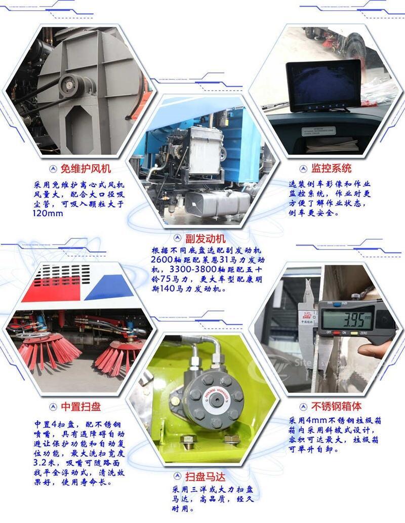 上装标配:带4个扫盘、江铃副发动机、三洋马达、施耐德控制开关、海普瑞斯电磁阀组、无级变速自动离合器、免维护离心式自动风机、不锈钢垃圾箱、尾部LED箭头指示灯、手动泵应急系统、中联北极星电子水泵,垃圾举升自卸功能。
