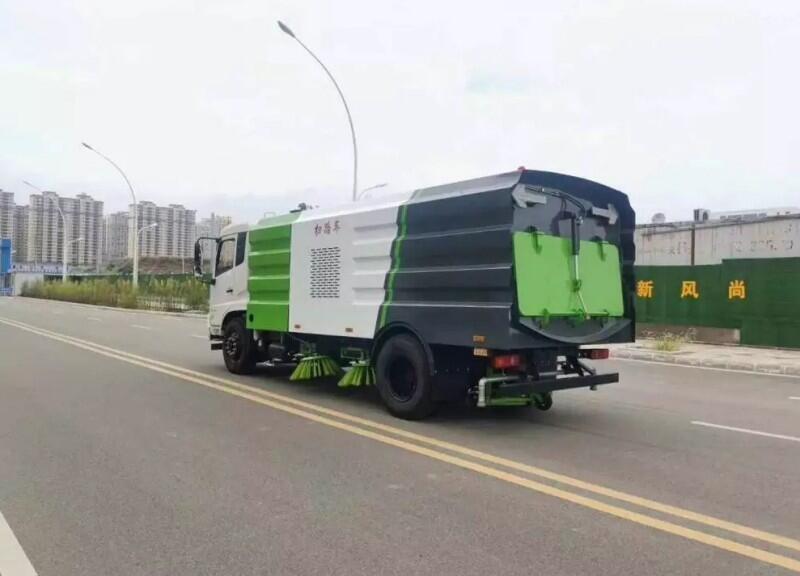 4、东风天锦12方扫路车采用吸扫结合的方式收集垃圾,湿式除尘、电液控制,液压倾翻卸料的作业方式对路面进行清扫作业。