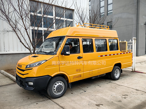供应依维柯得意13座电力工程车 电力抢修车 依维柯13座工程救险车 配置:整车设置3+2+4座椅模式,后排窗户带遮阳帘,整车空调,车顶部安装行李架,后爬梯,车辆后部设有车斗
