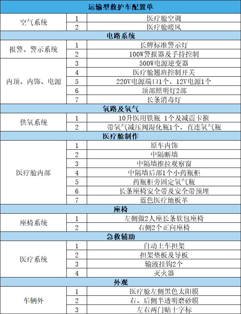 程力国六江铃福特v362短轴中顶救护车改装主要配置?国六(柴油)江铃福特v362短轴中顶运输型救护车,改装类容包含,医疗舱空调、医疗舱暖风、长排标准闪灯、100W爆闪器手持控制、500W电源逆变器、医疗舱翘板控制开关、220V电源端口1个,12V电源1个、顶部照明灯2部、长条消毒灯、10升医用铁瓶 1个及减震卡箍、带氧气减压阀湿化瓶1个,直连氧气瓶、原车内饰、中隔断墙、中隔墙推拉观察窗、中隔墙后部1个小药瓶柜、药瓶柜旁固定氧气瓶、长条座椅安全带及安全带预埋、蓝色医疗地板革、左侧做2人座长条软包座椅、右侧2个正向座椅、自动上车担架、担架垫板及导板、输液挂钩2个、灭火器、医疗舱左侧黑色太阳膜、右、后侧半透明磨砂膜、左右两门贴十字标。程力国六江铃福特V362救护车配置图片价格。