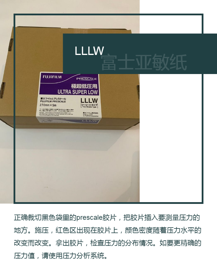 此款压力测量胶片是基于富士胶片公司的薄膜涂层技术而研发的,胶片整体设有压力测量感应,能够一目了然的检查整个面的压力分布情况。