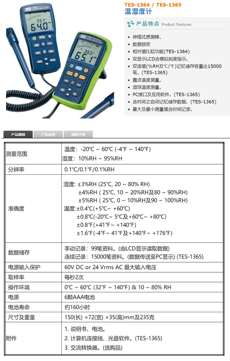 泰仕TES-1364/TES-1365 数字式温湿度计 带记录温湿度表 温湿度仪 品牌 | 泰仕TES | ||