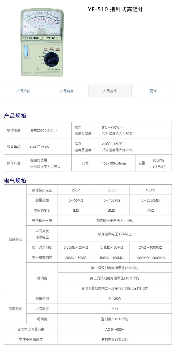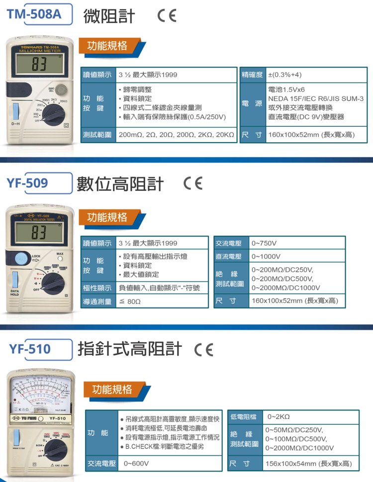 YF-509/YF-510数位高阻计台湾泰玛斯TENMARS绝缘电阻表指针兆欧表 品牌 | 泰玛斯TENMARS | ||