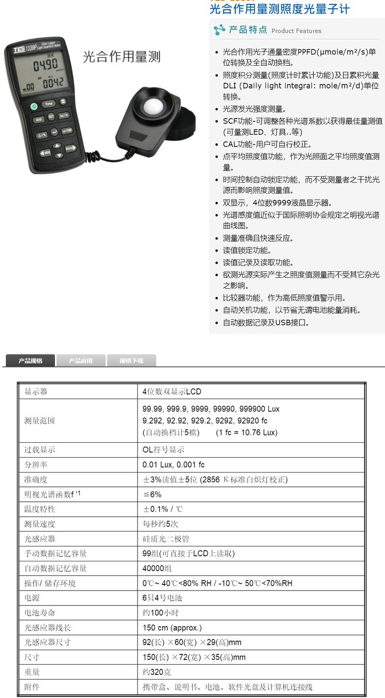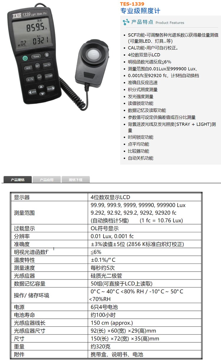 泰仕TES照度计照度仪TES-1335/1336A/1337B/1339/1339R照度表 品牌 | 台湾泰仕TES | ||