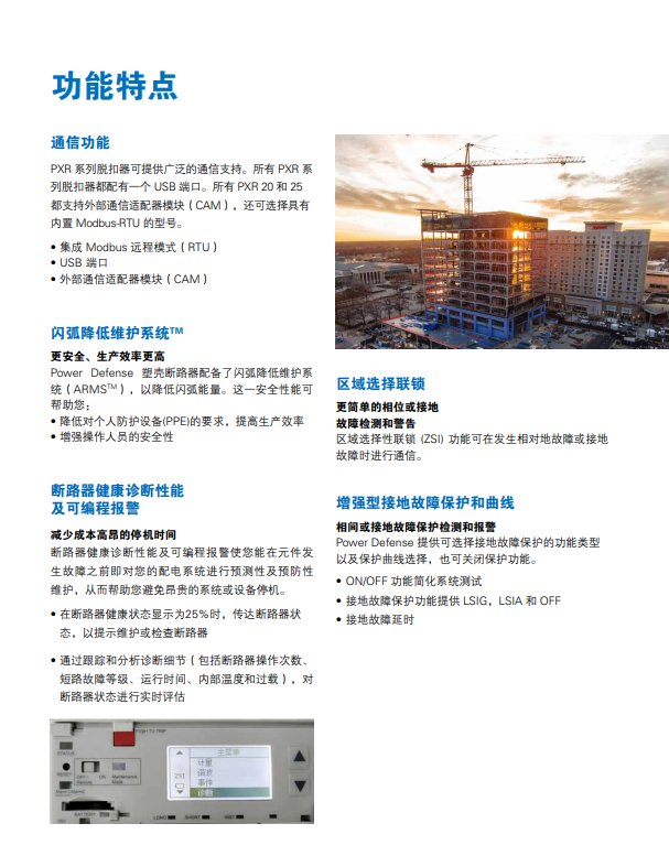 减少成本高昂的停机时间 断路器健康诊断性能及可编程报警使您能在元件发 生故障之前即对您的配电系统进行预测性及预防性 维护,从而帮助您避免昂贵的系统或设备停机。 ? 在断路器健康状态显示为25%时,传达断路器状 态,以提示维护或检查断路器 ? 通过跟踪和分析诊断细节(包括断路器操作次数、 短路故障等级、运行时间、内部温度和过载),对 断路器状态进行实时评估