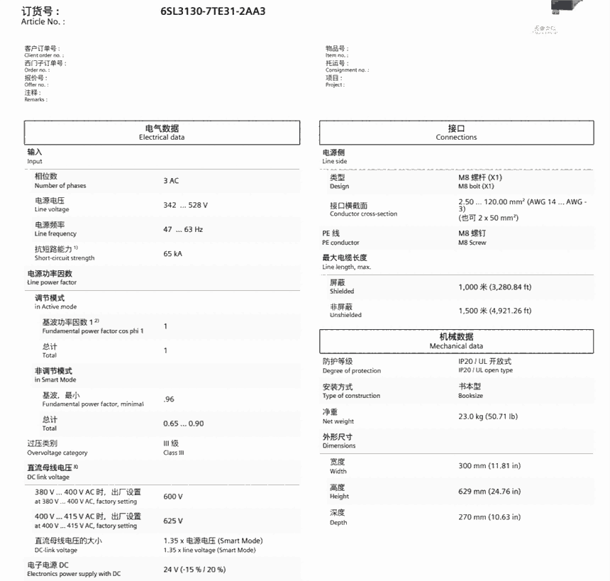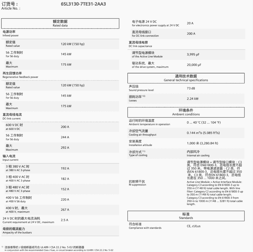 SINAMICS S120 Active Line Module 输入:3AC 380-480V,50/60Hz 输出:600V DC,200A,120kW 结构形式:书本尺寸 内部风冷 包括 Drive-CLiQ 导线