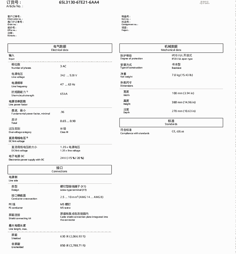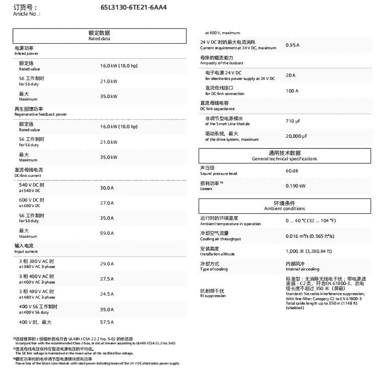 SINAMICS S120 Smart Line Module 输入:3AC 380-480V,50/60Hz 输出:600V DC,27A,16kW 结构形式:书本尺寸 内部风冷 包含 DRIVE-CLiQ 电缆