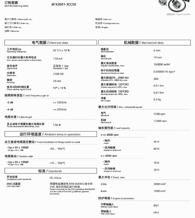 增量编码器 6FX2001-3CC50 带有 增量编码器 6FX2001-3CC50 带有 1-V-Sinus 2500 I/U 同步法兰; 轴 6mm 1-V-Sinus 2500 I/U 同步法兰; 轴 6mm 工作电压 5V 通用电缆出线 轴向/径向 导线 1m 带插头 工作电压 5V 通用电缆出线 轴向/径向 导线 1m 带插头
