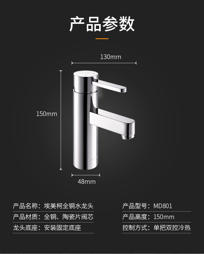 埃美柯洗脸盆龙头单柄双控面太盆冷热水酒店宾馆用龙头送软管2根