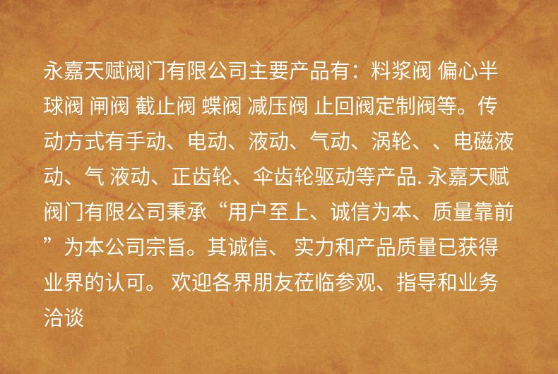 永嘉天赋阀门有限公司 智能客服智能客服在线解答,若涉及资金打款事宜,务必与厂家进行电话确认。