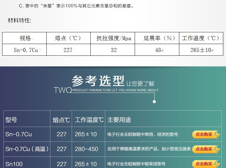 本款产品为:无铅环保耐高温焊锡条。可以适应锡炉温度至450摄氏度,有很强的高抗氧化性能,大大减少锡渣的产生,适用于小变压器引脚、漆包线等上锡。