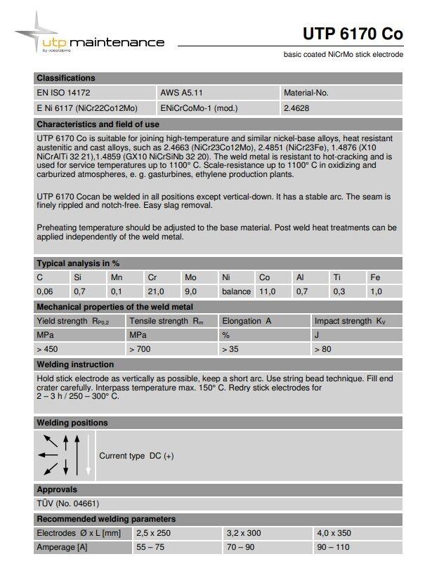 德国UTP 6170 Co镍基焊条ENiCrCoMo-1镍铬钴钼焊条