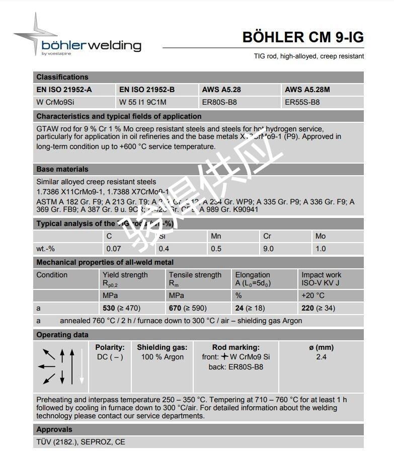 Classifications EN ISO 21952-A EN ISO 21952-B AWS A5.28 AWS A5.28M W CrMo9Si W 55 I1 9C1M ER80S-B8 ER55S-B8 Characteristics and typical fields of application GTAW rod for 9 % Cr 1 % Mo creep resistant steels and steels for hot hydrogen service, particularly for application in oil refineries and the base metals X12CrMo9-1 (P9). Approved in long-term condition up to +600 °C service temperature. Base materials Similar alloyed creep resistant steels 1.7386 X11CrMo9-1, 1.7388 X7CrMo9-1 ASTM A 182 Gr. F9; A 213 Gr. T9; A 217 Gr. C12; A 234 Gr. WP9; A 335 Gr. P9; A 336 Gr. F9; A 369 Gr. FB9; A 387 Gr. 9 u. 9CR; A 426 Gr. CP9; A 989 Gr. K90941
