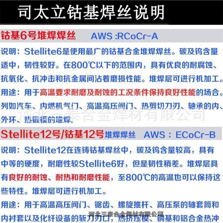 说明:高碳钴铬钨合金焊芯的钴基堆焊焊条,采用直流反接,渣覆盖性好,成形美观,具有优良的耐磨、耐热、耐腐蚀性,在650℃高温也能保持这些特性。