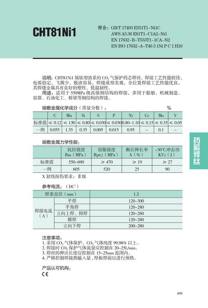 说明:CHT81Ni1属于钛型渣系的CO2气保护药芯焊丝,焊接工艺性能较佳。电弧稳定,飞溅少,脱渣容易,焊缝成型美观,全位置焊接工艺性能优良。其焊缝金属具有良好的塑性,低温韧性。