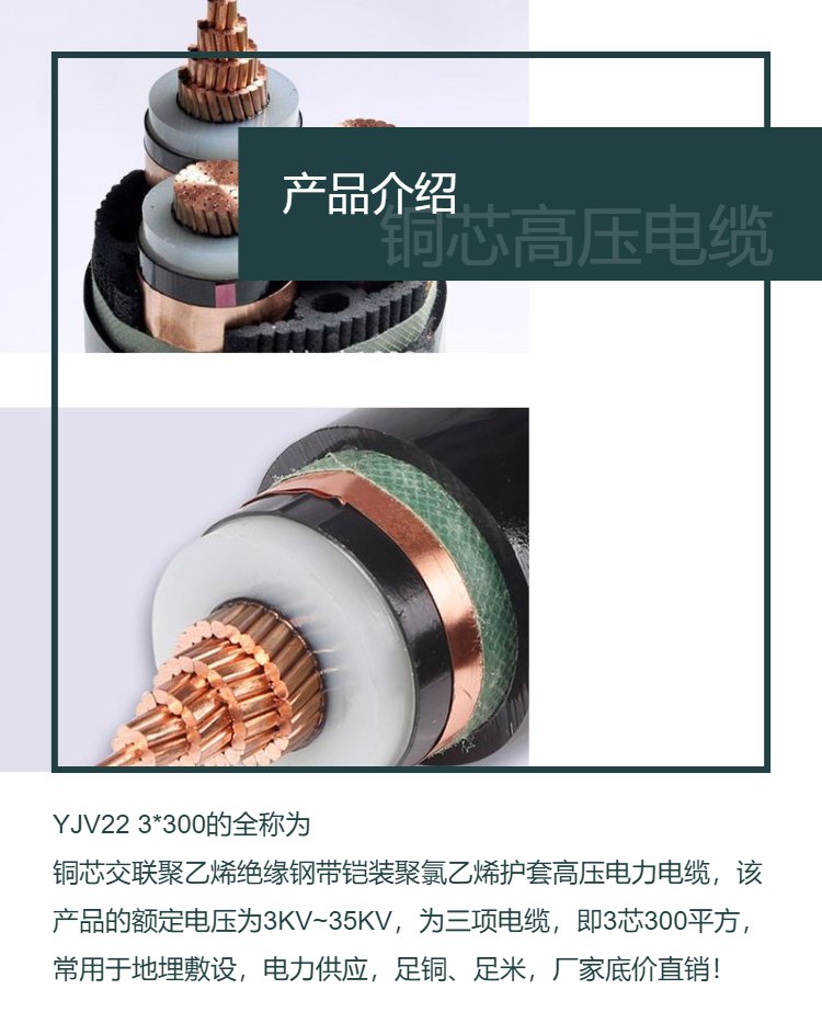 国网电缆集团,是一家多年从事生产YJV22 10KV 3*300(老牌厂家足铜足米YJV22 3芯300平方)专车全国供货大量现货)等电线电缆的老牌厂家,本厂生产的各类电线电缆均为纯国标产品,可以通过国标全项检测,实力厂家,库存大量现货,全国专车供货。