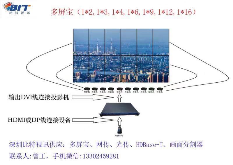 3.支持1*N/N*1/M*N以及旋转90度等比拼接不拉伸,不变形。 一路进三路出,单口上大分辨率。 支持大规模极联与并联。 4.3*3单个信号上大屏,最大分辨率支持3840*800,与拼接盒相比分辨率,清晰度,视野等均提升9倍。支持投影解决方案,一分三*N
