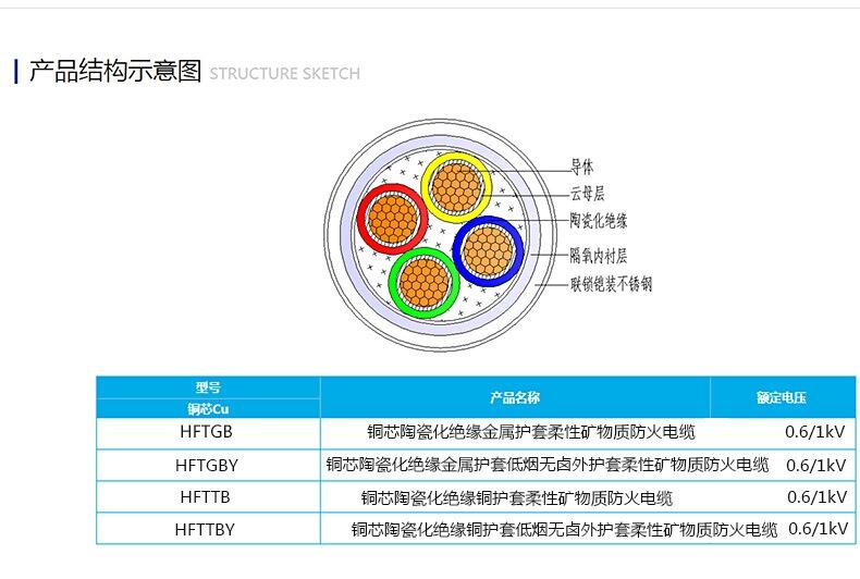 6、产品结构:JX-HFTGB)柔性矿物绝缘电缆是由铜绞线、矿物化合物绝缘、无缝铝护套包覆、矿物填充层和高阻燃低烟无卤外护套所构成。其采用柔性结构,主要材料均采用无机材料,弥补了结构硬、易燃烧、有毒等缺陷。