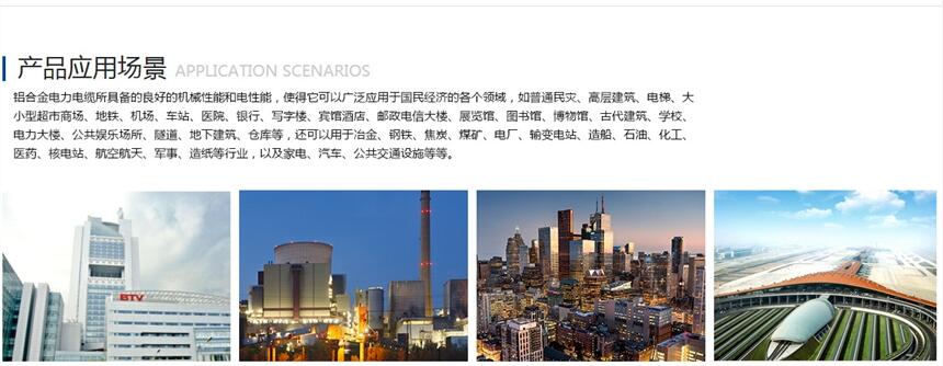 产品用途:铝合金电力电缆所具备的良好的机械性能和电性能,使得它可以广泛应用于国民经济的各个领域,如普通民灾、高层建筑、电梯、大小型超市商场、地铁、机场、车站、医院、银行、写字楼等行业