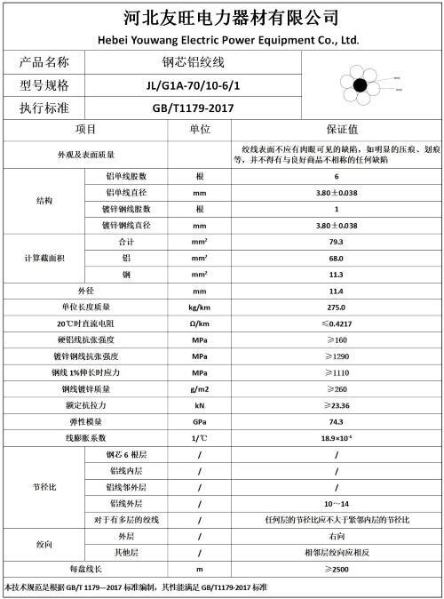 四、国标钢芯铝绞线JL/G1A70/10现货供应产品基本参数及样本图片:
