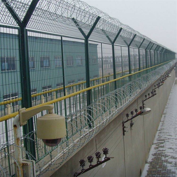 安平县艾瑞金属丝网有限公司 生产 拘留所 边防、哨所、机场、核电站等高防护厂所的隔离网。高防护的隔离网相对于普通民用隔离丝径更粗,立柱,边框壁厚更厚一些,因此也更加坚固 隔离网由两部分构成:护栏网 刀刺网