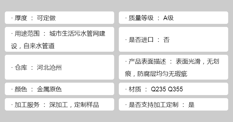连接方式 | 焊接连接,双金属连接,承插口连接,卡箍连接,丝扣连接 | ||
