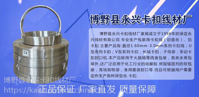 本产品采用优质铝杆为原料,并通过相关部门检验,符合国家标准,除用于火腿肠等肉食包装.各类水果包装外,还广泛应用于化工行业的硅酮胶.树脂锚固剂的软包装.商场购物袋等.而且可根据用户需要定作生产各种异型丝.卡扣.