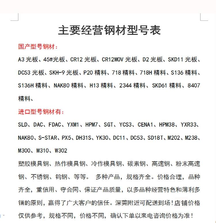 东莞市宝逸金属材料有限公司是一家以经营优特钢为主的公司目前所销售的钢材有1000多种,现有:热作模具钢,冷作模具钢,镜面模具钢,压铸模具钢,机械用钢,冷拉钢,冷轧钢、方钢,工具钢,结构钢,碳素钢,中碳钢,粉末钢,高速钢,钨钢(硬质合金钢),铬钢,铬钼合金钢,耐热钢,不绣钢,拉力钢,轴承钢,弹簧钢,冷镦钢,合金工具钢等等优特钢材、、、、、我公司具有品种齐全、质量稳定、价格优惠、送货快捷。公司现设有下属加工、销售、配送。集销售进口模具钢,塑胶模具钢,热作模具钢,冷作模具钢,高速钢,钨钢(品牌有瑞典“一胜百”、奥地利“百禄”、日本“日立”“大同”、德国“撒斯特”);代理分销(抚钢、长钢、舞钢、冶钢、宝钢)特殊模具钢;钢材深加工及真空热处理等一条龙服务。我们经营的模具钢品种规格齐全化,档次多元化,服务配套化,适合于不同模具制造企业的不同层次的需求。针对于货期的要求我们实行高效送货制(毛料当日、精板光板次日);免费送货上门;保证质量,包换、包退。 经营原则:客户满意,精益求精。 企业精神:优质服务,持续改进。 企业追求:质量为基,管理为本。 企业目标:整合资源,发挥综合优势,将公司打造成珠三角地区具有规模化的企业。 立足诚信、携手并进、我们期待与您的合作!