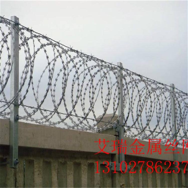 刺丝滚笼-刀片刺网-螺旋刀片刺绳是冲剪钢板成锐利的尖刀带子,然后包裹中碳钢丝(筋丝)之上。刀片刺丝是从海外引进的绝对禁止通过的新型隔离产品。锋利的刀片刺丝由双根线扣卡子组装后成蛇腹状,让人看到不寒而粟,能够起到了恐吓作用,实际上人挨上刀片刺丝就被划破,实际效果明显。该产品施工便利快捷。深受喜好。各国已将刀片刺网广泛用于飞机场重地、边境线、、政府机关、银行,以及别墅的围墙、高速公路、铁路护栏等地。