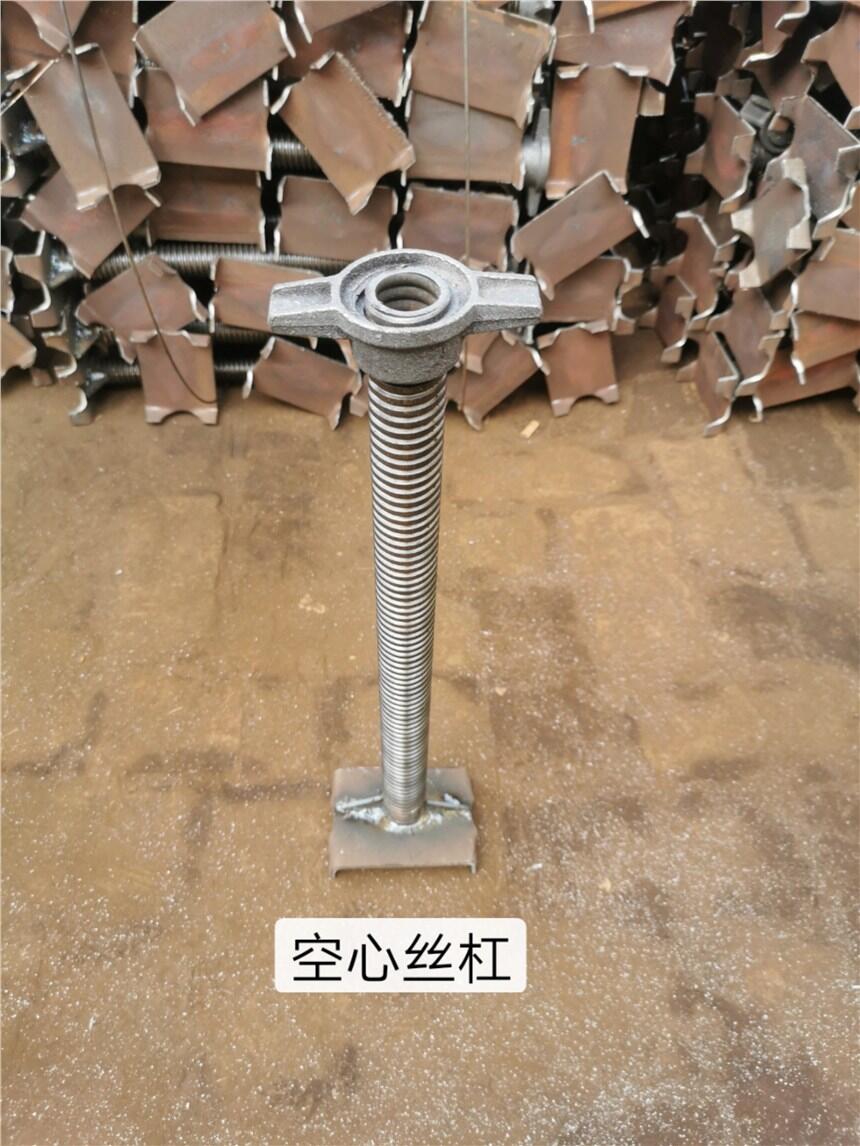 脚手架空心丝杠顶托是用于脚手架搭建中,一种可以起到对脚手架钢管上顶或者下托的建筑脚手架施工构件。一般顶托有丝杠底盘可调节螺母做成。
