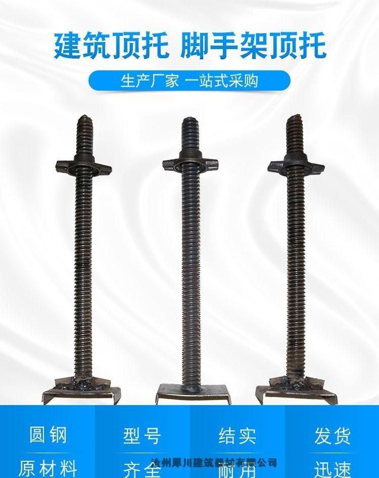 建筑顶托丝杠是为建筑的整体提升应力转移及调整支架,具有使支架应力转移平稳可靠,建筑物升高时位置偏移调整方便等特点,我厂生产的建筑丝杠种类多、质量好、价格合理。作为新型的建材工具,建筑丝杠应用范围十分广泛,广泛应用与道路、桥梁、地铁、隧道、电站等工程中配合脚手架的应用,起到很好的上顶,下拖固定作用。