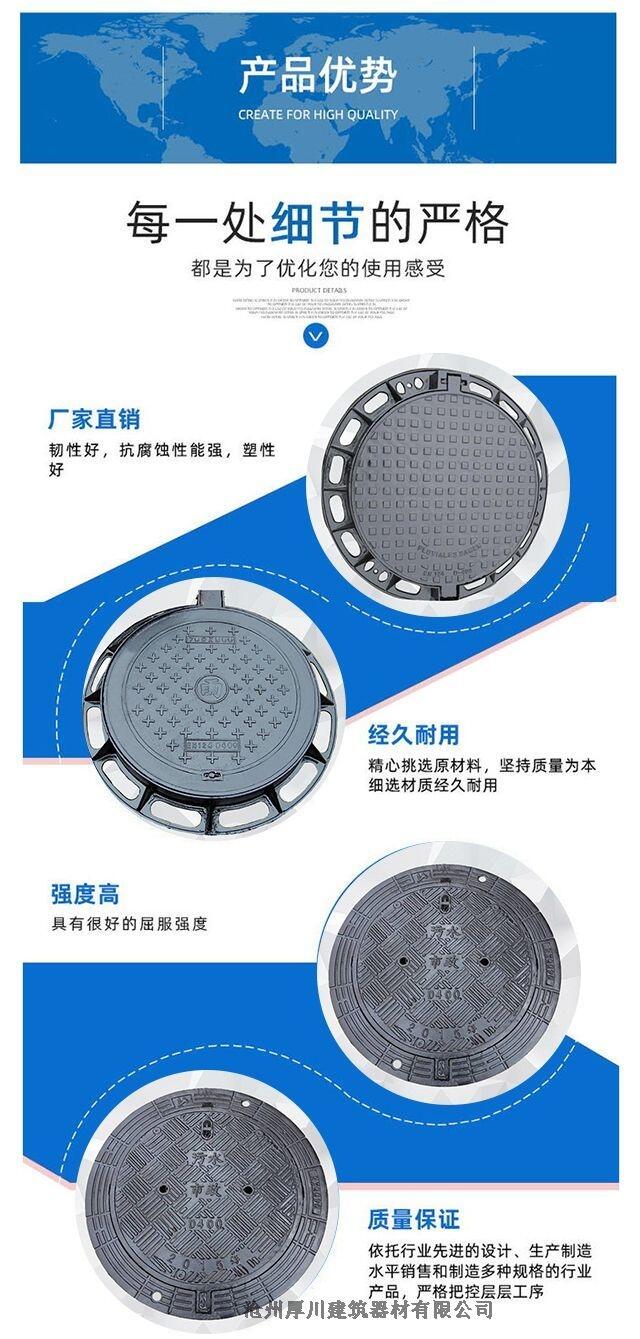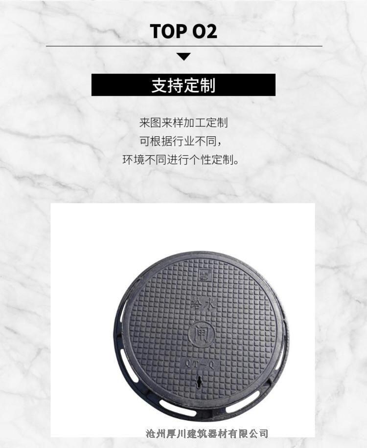 厚川牌铸铁井盖雨水篦子应用范围:球墨井盖主要应用领域:市政道路,高速公路,通信,电力,自来水,小区,学校等各种园区。